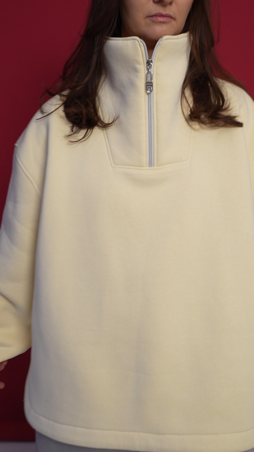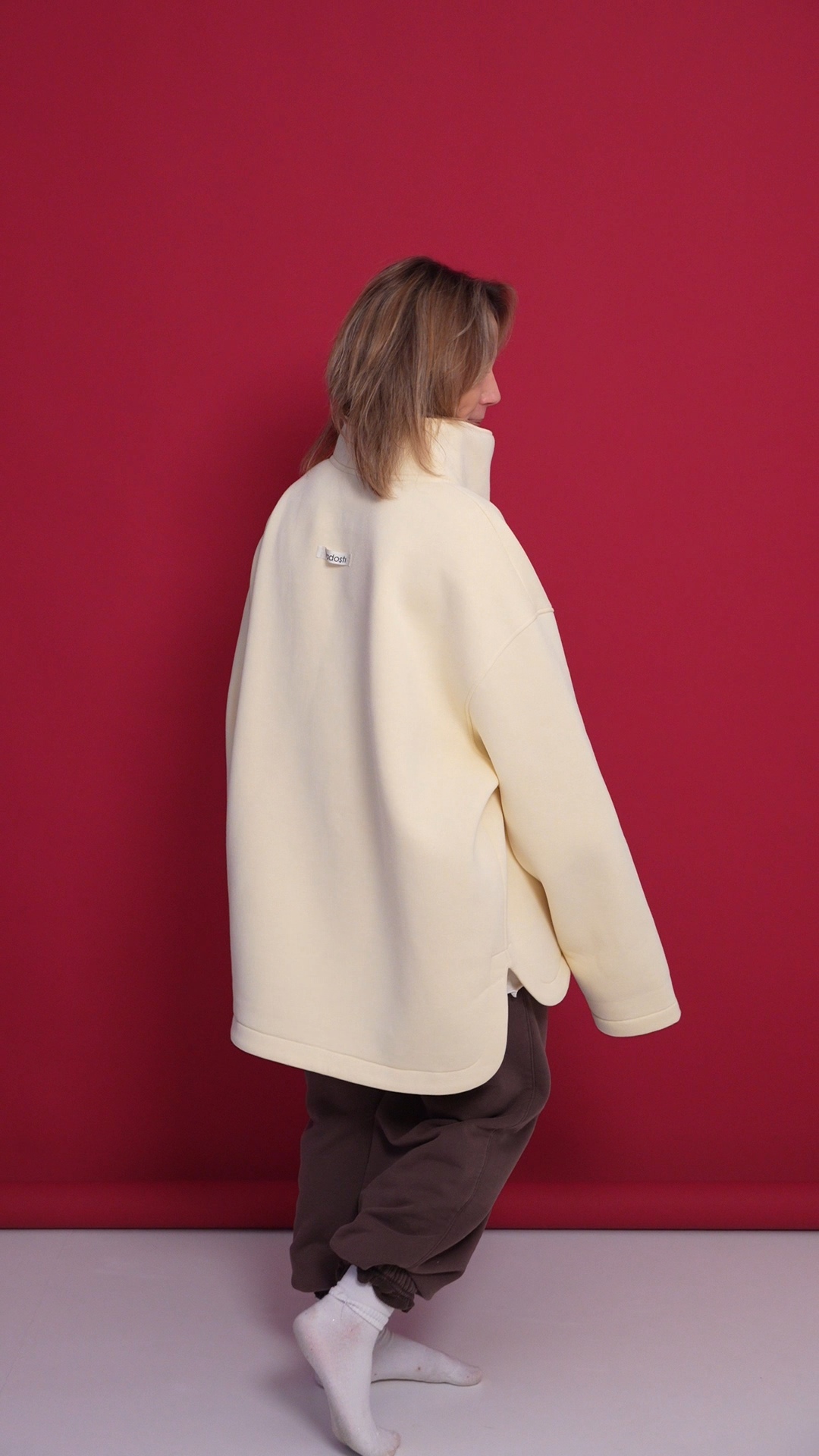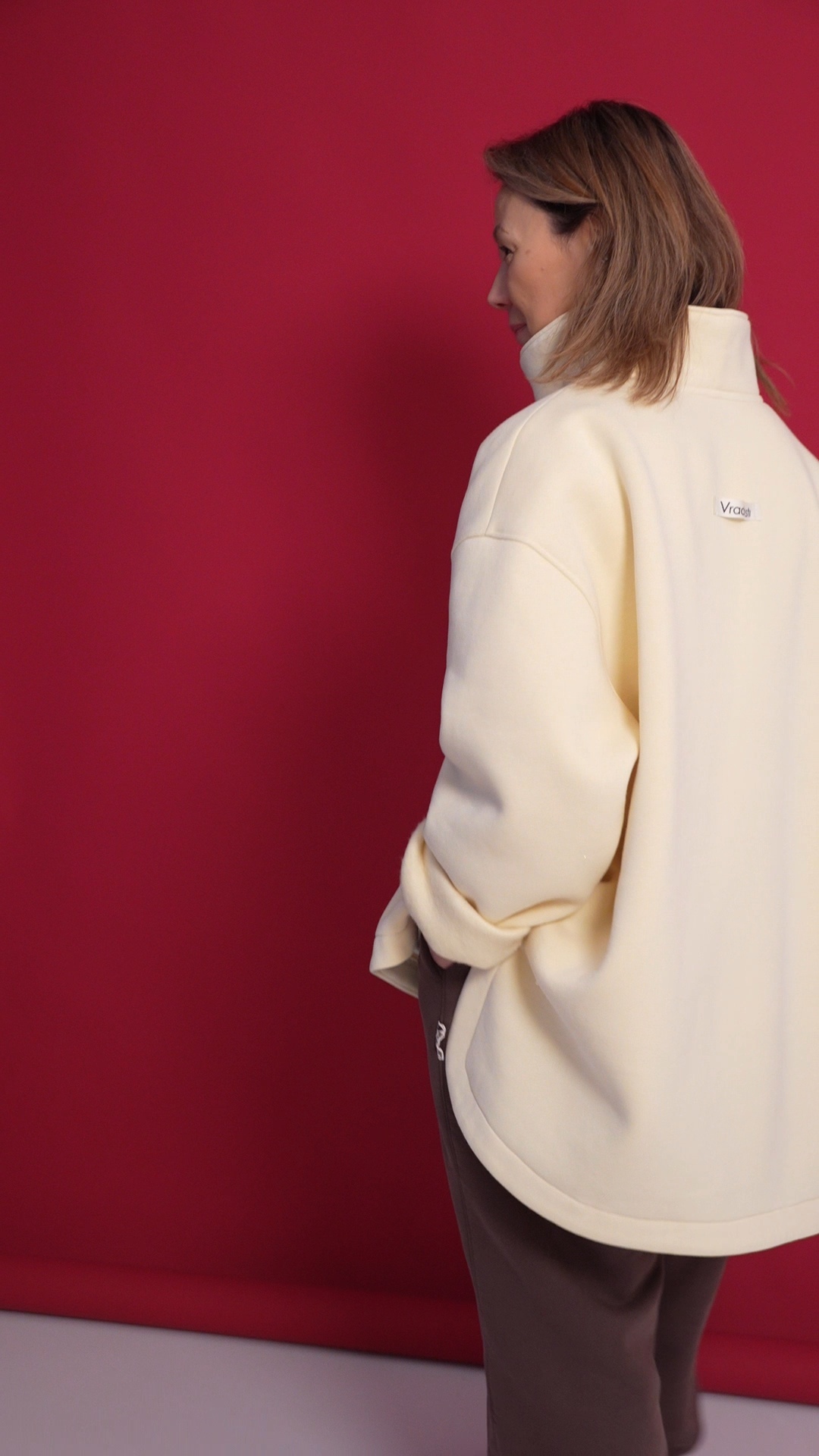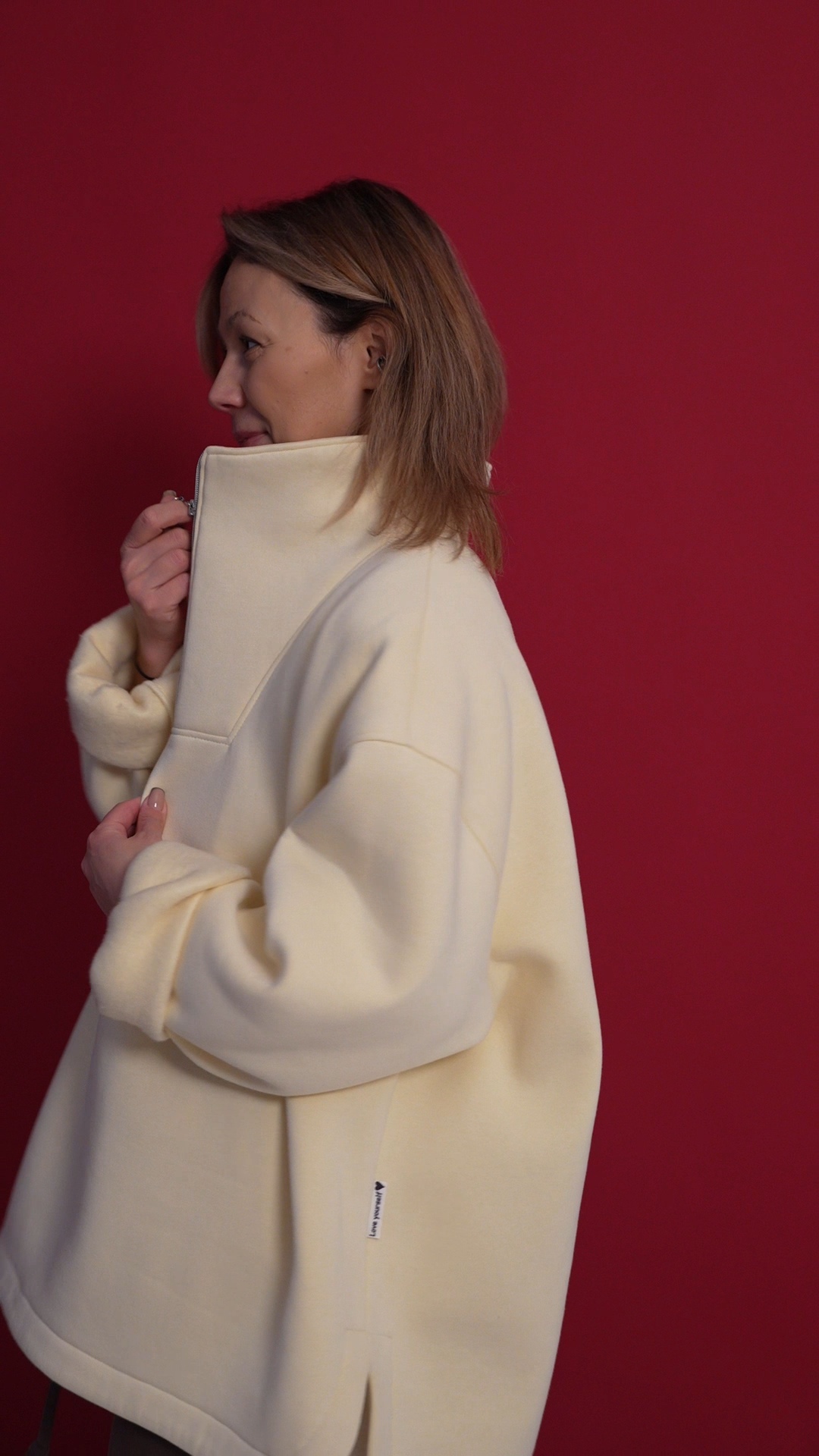 Выполнен из футера с велюр эффектом с начесом . Горловина застегивается на молнию, сзади нашивочка с логотипом VRADOSTI