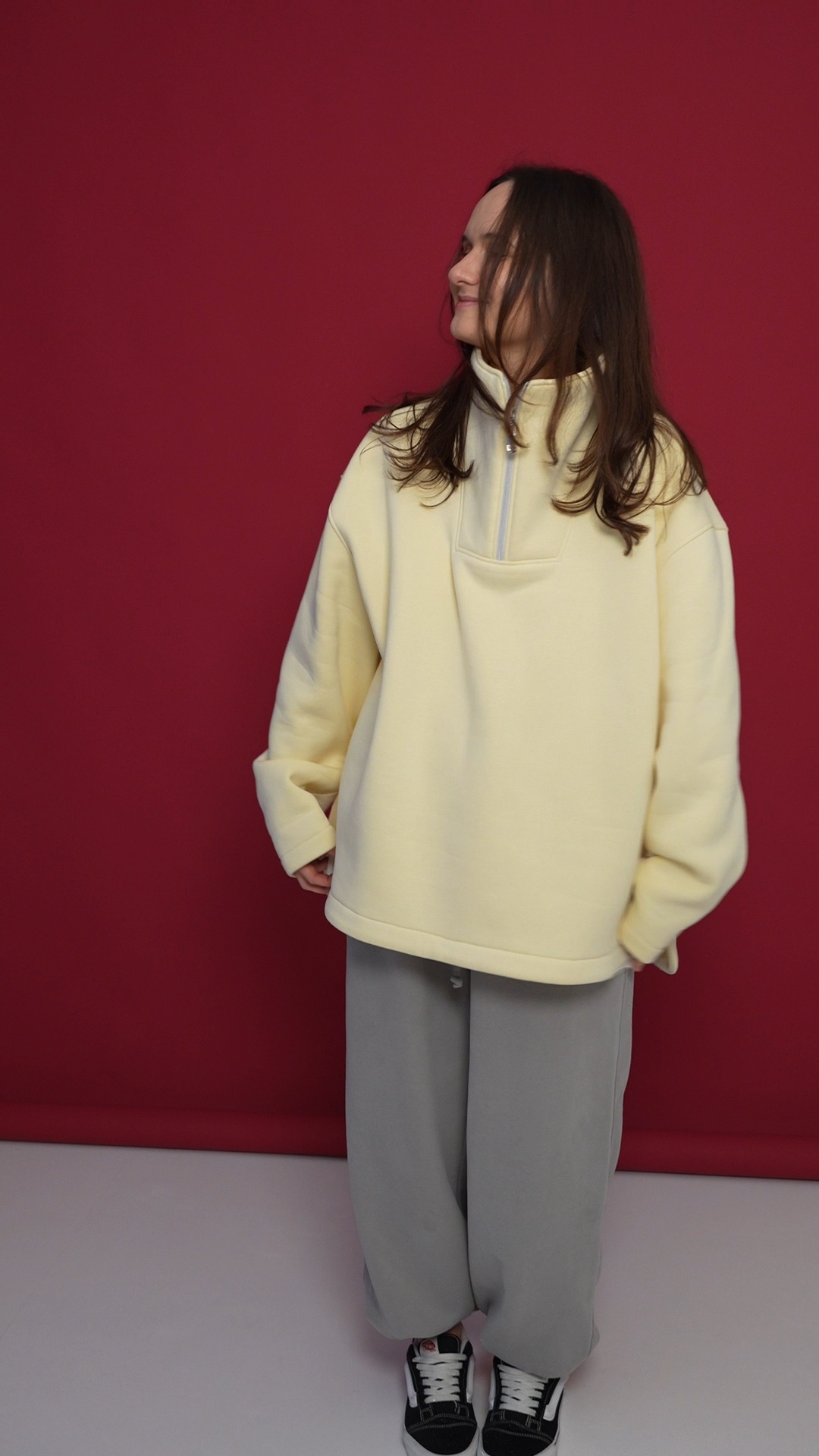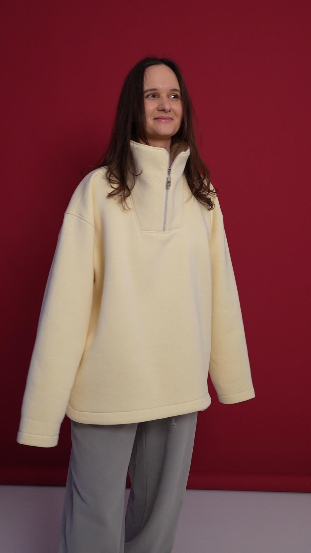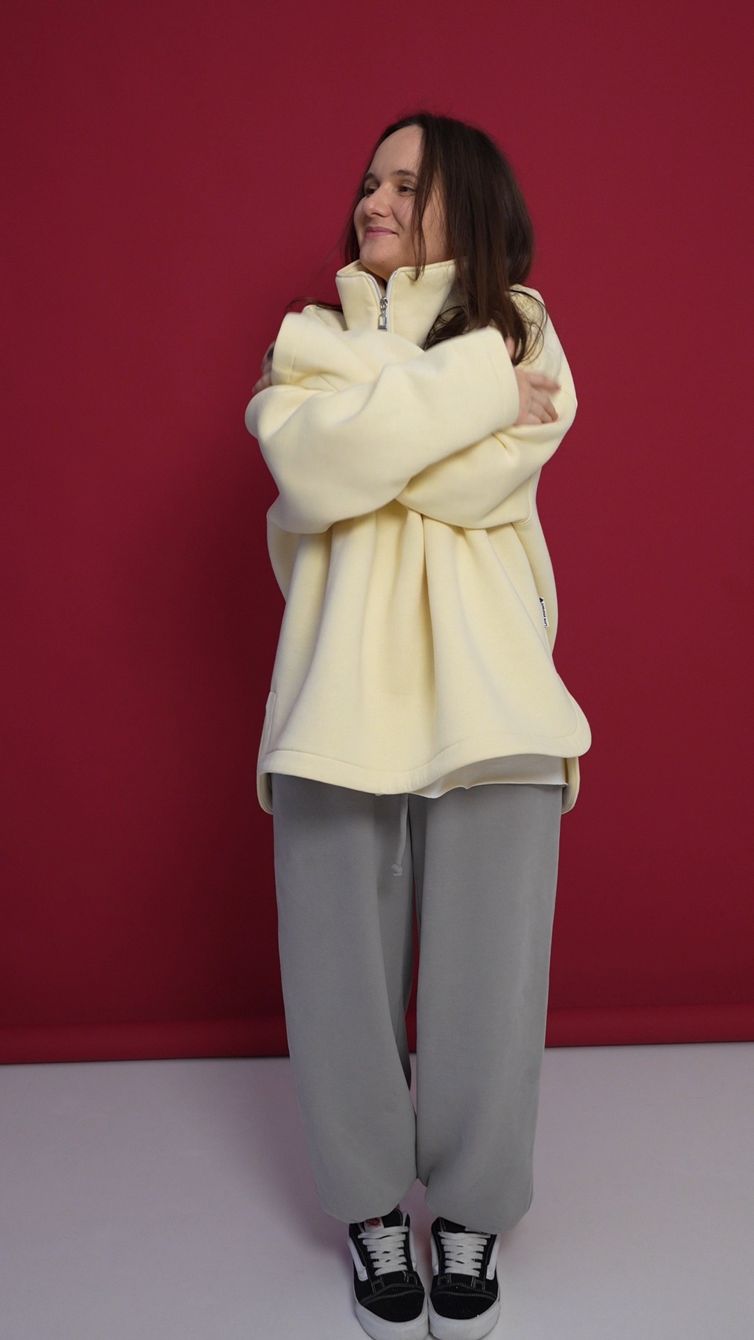 Выполнен из футера с велюр эффектом с начесом . Горловина застегивается на молнию, сзади нашивочка с логотипом VRADOSTI